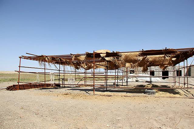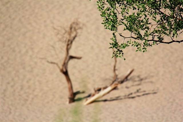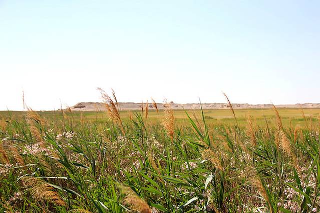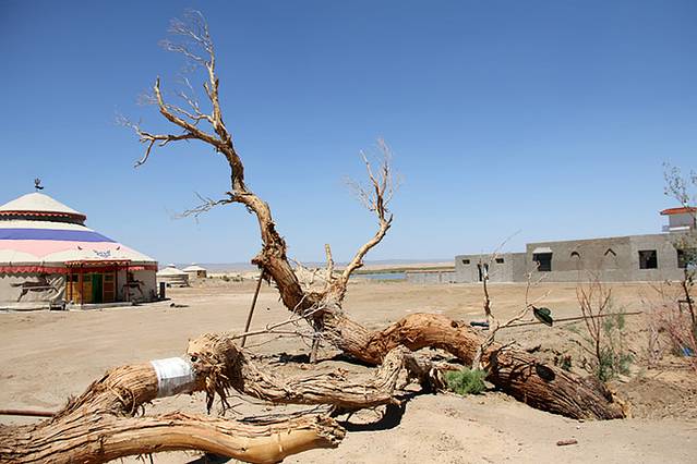 一路都是成片的枯萎了的胡杨树,最郁闷的是因为头些天下雨,路被冲得相当之烂,车子被迫原路返回。路边是几米高的芦苇,找不到掉头的地方,只能倒着把车开回去,司机累得够呛。中途还陷进泥坑,费了不少时间。总之是又热又颠又无风景可言,窝了我们一肚子气。特别是登峰童鞋,他很愤怒的给我说,虽然他只有一天时间玩,但之前一直是心情很愉快,在这里被搞得什么兴致都没有了。我连忙安慰他,好事多磨,雅丹肯定有看头。