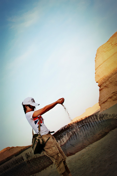 十点多钟被丁姐叫醒,原来,有两位才到的顾客正要此刻去鸣沙山,小丁老板叫我们一路。这便是后来同我一起前往嘉峪关,张掖,兰州的两位来自宁波的朋友,鲍鲍和carrie。我们跟随小丁老板从一条小路绕道而行,这让我回想起第一次旅游去黄角树瀑布逃票时造成的厄运经历,不知道这一次成功与否,心里有丝小紧张。