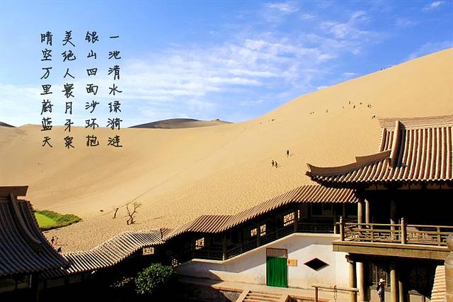 步行几百米后,便看见不远处夕阳下的沙海茫茫。“噗通,噗通”我仿佛听见了自己的心跳,终于可以领略苍茫大气的大漠风情啦,帅!鸣沙山月牙泉门票120元/人,学生证半价,军官证全免。鞋套10元/人,骑骆驼100元/人,滑沙20元/人。建议大家填饱肚子5点半左右出发,我因为睡过头,8点才去,没多久太阳就落山了,滑翔机也没做成,呜呜~~~~(>_<)~~~~