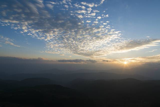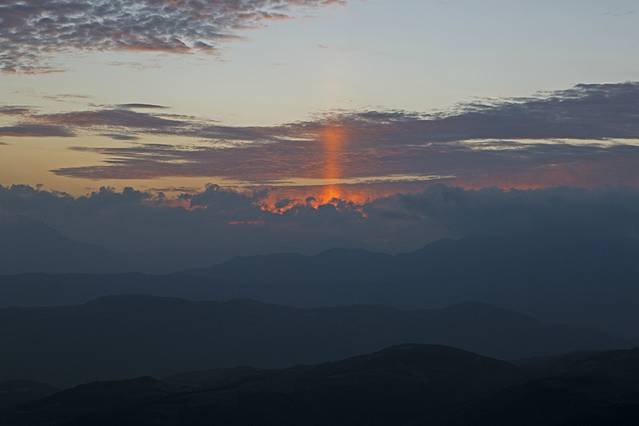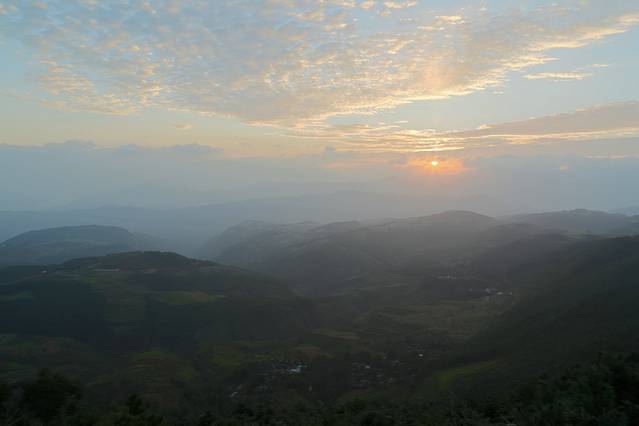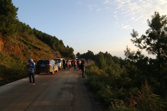 第二天天还没亮就起来拍摄日出。拍日出的最佳地点叫打马坎,当时一听到打马坎这个名称就觉得耳熟,回程留意了一下,果然京昆高速有个隧道就叫打马坎,原来这地点就在高速公里所经的山顶上。虽然天才蒙蒙亮就到了打马坎,却发现我们来晚了。所有能拍摄日出的地方都挤满了人,坎上坎下,路边坡顶。无奈之下四处寻找,终于和一位没用三角架的哥们商量给我让出了一个勉强立住三角架的地方。