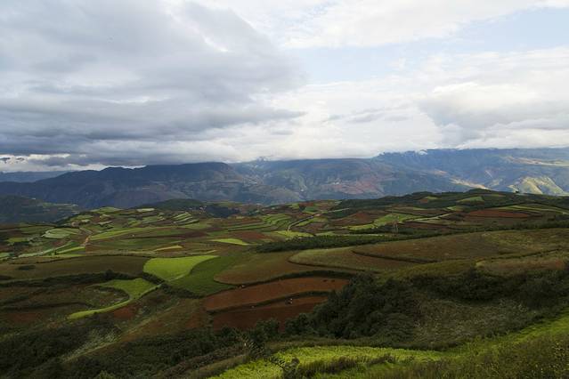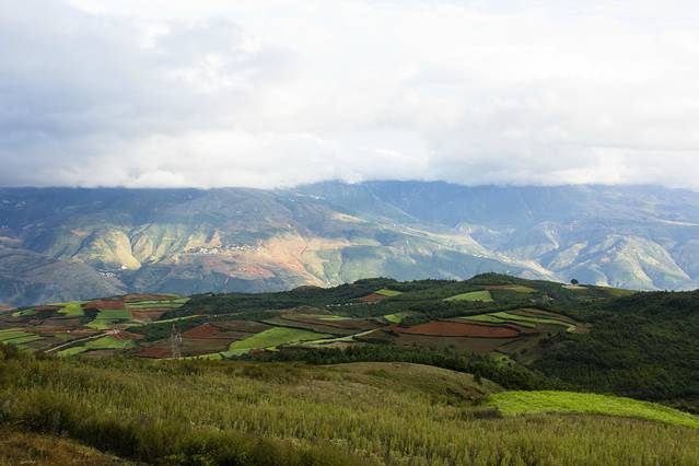 初到红土地感觉这种景色在西南地区并不少见,红土、绿树、青草勾勒出的是西南山区典型的山野景象。登高望去,顿时发现这里的独特。收割了庄稼的露出褚红色的红土,成熟的土豆地里绿色中泛出白花,种着新苗的土地里透出的是嫩绿,裸露已久的田地已成褐红。大块的色彩涂抹在山坡上,绚丽而不斑驳,随意却不杂乱。配以远处的青山,白云中透出的丝丝阳光,宛如一幅随手翻开的画卷。