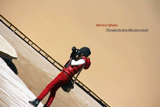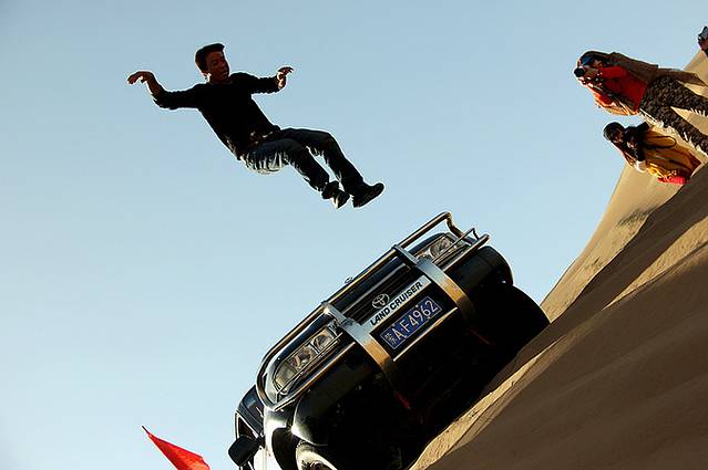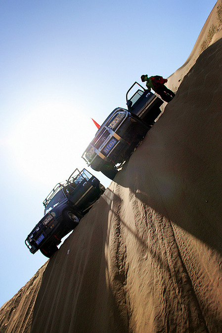 个人觉得,胆大的朋友坐副驾驶,恐怖感是最强烈的,而且视觉效果相当不错,有像在看3D电影的感觉。当然,这也得和司机的车技成正比,反正我是嚷嚷着叫加木苏师傅多来点刺激的,加木苏师傅笑而不语。车子缓缓爬上一个较高的沙丘,在顶端停下。哎呦,妈呀,这坡度未免来得太抖了吧,从我这个角度看上去几乎垂直。(其实大概70-80度)我立马被吓坏了,完全没有心理准备体会这传说中的“惊魂7秒钟”。加木苏师傅让我们下车,说别怕,别怕,我就是让你们拍拍照,还好,还好。