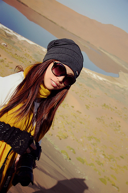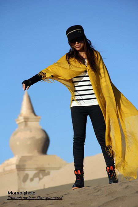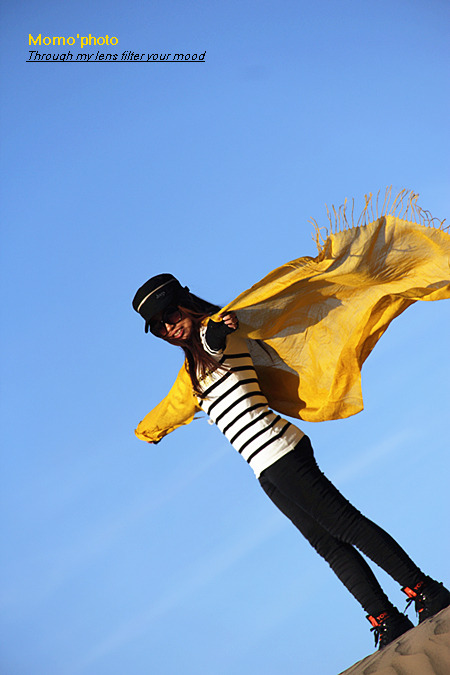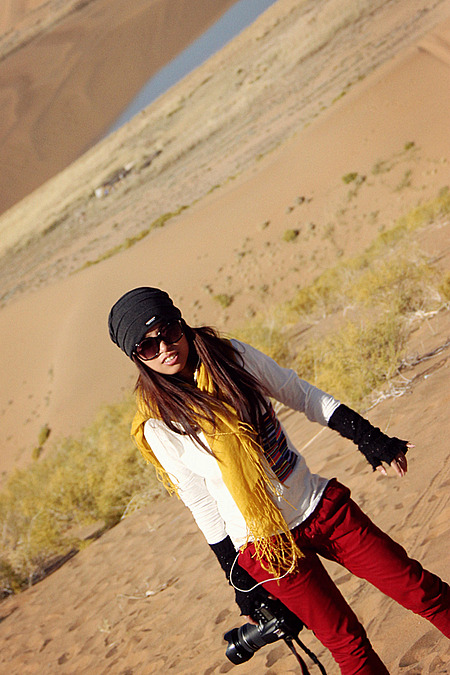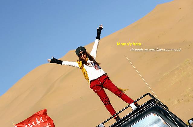 最后,加木苏师傅带我们去滑沙。都说爬沙山累,这次都没有说谎。(=@__@=) 据说这沙山是世界最高鸣沙山,真的好高,虽然我有恐高症,但还是想听听鸣沙的声音,硬起头皮上。整个沙山就我们几个人,但发出来的声音好响的说,"咕咕咕“的,像摩托车发动机的声音,自己轻轻滑的时候,又有点像放屁来着,O(∩_∩)O哈哈~