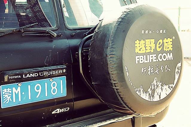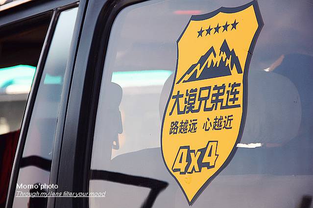 早上9点,车队准时来右旗接我们,右旗离巴丹吉林沙漠大约1个半小时车程。车队是鼎鼎大名“韦小宝”创立的——大漠兄弟连。韦小宝其实是魏小宝,因为同音,被大家喊着喊着,就变成鹿鼎记里面的韦小宝了。大家一听这名号就会开始去猜测这仁兄是个撒样的人,是否真如金庸笔下的小宝一样,幽默风趣,足智多谋。大漠,兄弟连,爵爷,韦小宝,就算想不起斯皮尔伯格的《兄弟连》,也会联想到名噪一时金老先生《鹿鼎记》,总之是噱头十足。说了这么多,相信大家都想见见本尊,可惜因为他贵人事多,换了另一位师傅——加木苏,确实不是故意吊大家胃口的,可别拿砖头拍我,嚯嚯O(∩_∩)O~