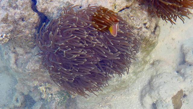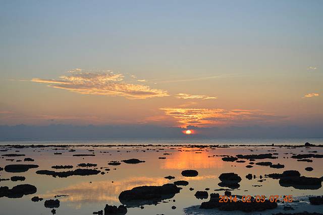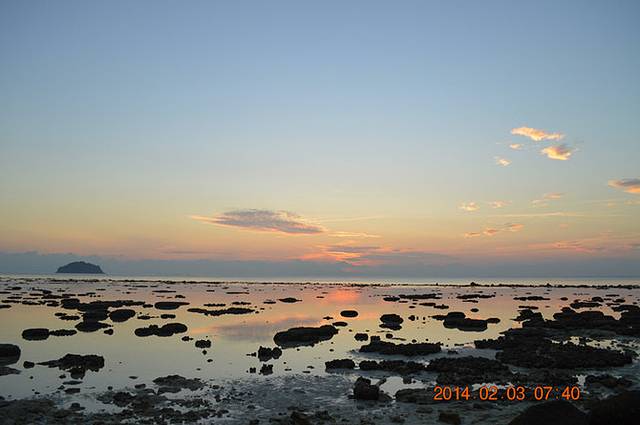 可是等我们放好东西,换好泳衣,涂好防晒霜出来,已经开始退潮了……根本就不能浮潜了……于是,看海葵,看海胆,看尼莫,用走就好了……走到对面那个小岛,水都不过腰……不过日出海滩的沙有点粗,也有死珊瑚什么的,走的时候要穿潜水袜,不然有点扎脚。