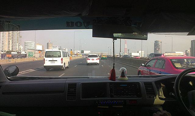 不一会儿工作人员就带领大家来到门外不远的停车场,登上13座的商务车,车子很新很干净,人满了就出发了。短短的十几个小时就换了3个泰国的机场,机场次序井然,完全没有任何大选政局的影响。看来我们是白担心了。在车上大家睡意就没有了,都在交换泰国电话号码,出行前大家集体买了happy卡,于是通讯录上面登记的就是泰国米米,泰国兔子,泰国老公诸如此类的名字,哈哈哈~车子行驶了50分钟以后,来到了一个加油站,司机师傅让大家休息15分钟。真是贴心~!加油站有7-11,厕所,还有卖吃的。我和小C又饿了,然后我们又买了面包吃……大概又行驶了半个多小时就到码头了。