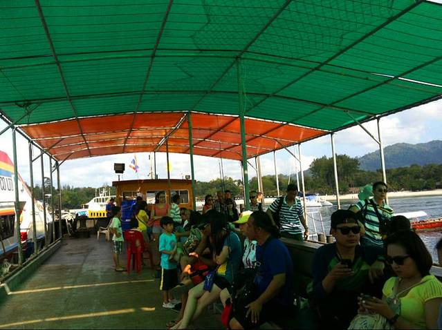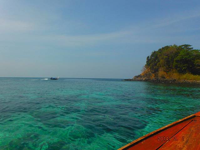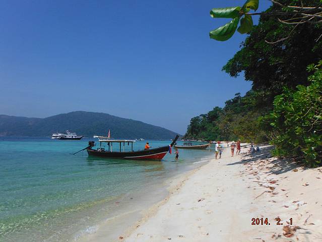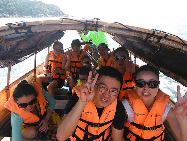 踏上平地的感觉真好~!!!由于lipe的几个海滩的坡度比较平缓,所以都要在这边换长尾船才能到达海滩。突然来了几条船,平台上好多人~!!我拨过人群,好不容易才帮大家买到了长尾船的船票,每人70B。等了好久才轮到我们上船。