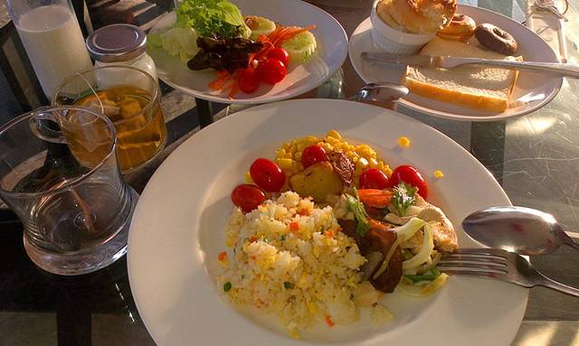 话说一觉睡到自然醒,其实也没多晚,8点多就醒了……其实是被隔壁anda的装修声音吵醒了。Anda还在修二期工程,游泳池什么的都还没修好。既然睡不着,就去吃早餐吧。田园早餐是自助偏西式的,精致而美味。蛋类菜肴有7种选择,面包有4、5种选择,牛奶果汁咖啡茶酸奶一应俱全,还有烤的西红柿和炸土豆,沙拉和超过4种不同类型的水果。而且因为中国客人多,也会供应适合中国客人口味的炒饭、炒陈村粉、蔬菜炒肉、汤等热食,非常贴心~!