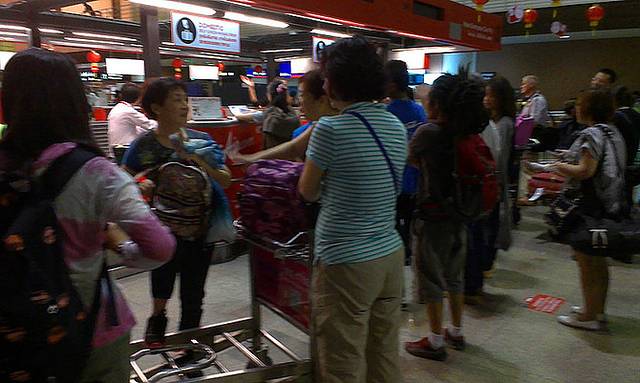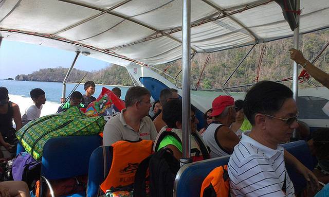 到了水上平台,找到亚航的桌子,拿出机票check in。工作人员会用你的预定编号和他手上的名单核对,核对好了,发给一个数字卡片,是上船的顺序,然后还把行李贴好标签,把行李先装上船。到了9点,工作人员开始念号码,大家按顺序上船。