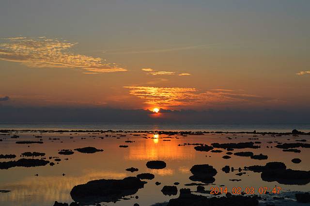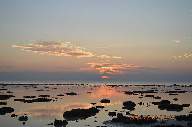 一大早,5点40,小C的手机就响了,嗯嗯嗯,该起来看日出了·!上了厕所,拿上手机我们就出门了,脸都没有洗,反正太黑,也看不见谁……走到沙滩,还一片漆黑,结果李老师走过我们身边好远,才发现是他……哈哈……小C和李老师向北走去。我觉得我没有清醒,我就决定再坐一会……