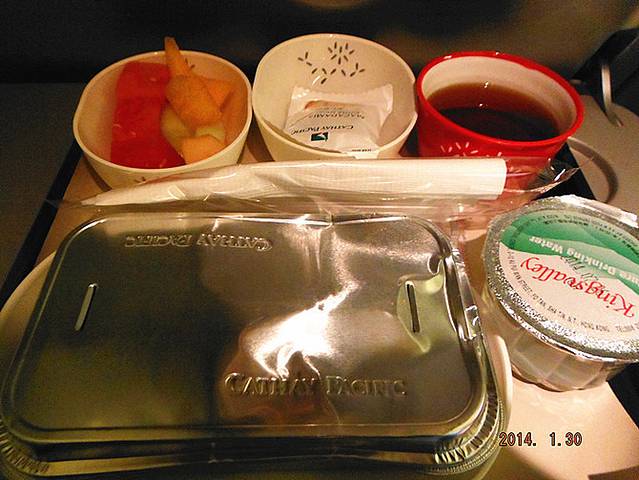 旁边空荡荡的座位就是小C的,哎……等了一下,屏幕上的起飞时间不断的推迟~!结果,足足晚了一个小时才起飞~!!!Orz,小C真可怜,其实完全可以赶得上嘛·!!!!起飞不久就开始发飞机餐了,由于晚餐吃太饱,我根本吃不下,尝了一口,国泰的饭味道很不错,最后,我只把水果吃完了,还灌了2杯茶~!!!!