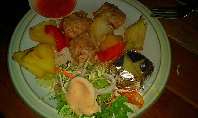 点了烤鱼,烤斑节虾,烤鱿鱼,沙拉,海鲜炒蔬菜,炒饭,冬阴功汤,啤酒,饮料等等~!,一共花费3400B。