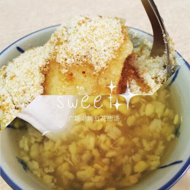 第四站,广场老牌豆花甜汤。因为真的吃得太多了,我们就跟着导航慢慢走过去。到达后马上点了份豆花和绿豆爽。老板娘打开旁边的木桶盖子,里面是豆花,只见她娴熟地用勺子刮了几下,把豆花扣在碗里,哗哗地加了黑糖和花生末,搞定。然后又在旁边的几个锅口中打开了其中一个锅盖,绿豆爽也上来了。吃一口豆花,马上鸡皮疙瘩掉一地,真的,甜到有点接受不了,豆花口感像布丁,挺扎实的,而且豆焦味很重。再尝一口绿豆爽,已经完全吃不出它的甜味了,我感觉这绿豆爽应该是薯粉羹加剥皮的绿豆做的,回家可以自己研究做下。这家店的东西真的得慢慢吃慢慢吞,因为真的太太太太太甜了