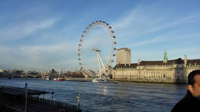 教堂对面的议会大厦这天不向游人开放,我们只好错过,但近距离看宫殿和大本钟,依然觉得十分雄伟、富丽堂皇。沿着威斯敏斯特桥向东过河,我们在傍晚时分来到伦敦眼。这座超大型摩天轮是为迎接千禧年而造,本来打算拆除的,但因颇受人们欢迎保留下来,也成为伦敦的一个标志和游客常去之所。在轮上的包厢里可以看到伦敦的全景,尤其是可在高处和泰晤士河合影,不容错过。一个包厢可容纳十五人,而我们隔壁的包厢里竟然被三个人包了,他们还带了红酒边赏景边酌酒,真是惬意非常。