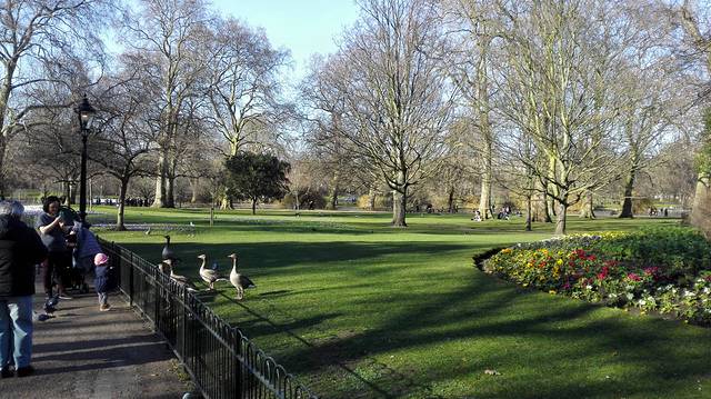 从博物馆出来已经比预想的晚,又绕了点路才在Leicester Square附近拿到了我们之前在网上购买的London Pass及Day Travel Card。吃完午饭已是下午两点,我们先是去白金汉宫参观了外景,然后沿着圣詹姆斯公园向泰晤士河边走去。冬天白金汉宫不开放,而且这天没有换岗仪式,只能瞻仰下宫殿的外景了。