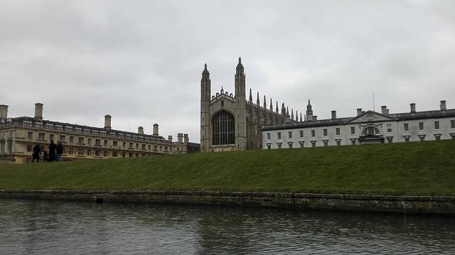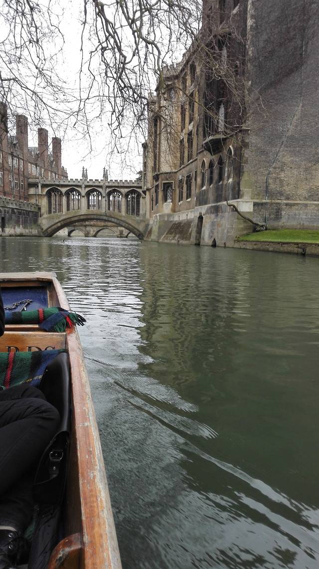 船夫是一个四十岁左右的大叔,用有些难懂的英文像我们介绍河两边的学院历史和轶事。在得知我们来自中国后,还特意学着用普通话诵读“轻轻地我走了”。如果不是小船,我们还难以得见叹息桥和数学桥的容颜。天有些微雨,坐在船中有些冷,但这反倒让周围的景色更加动人。河水中不时有鸭子游走,岸边是绿油油的草坪,这就是万物复苏时的剑桥。