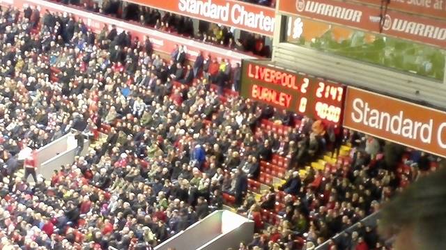 终于,比赛快要开始。现场的DJ介绍出场球员,球迷们为每一位球员欢呼。双方球员握手致意时全场开始高唱You’ll Never Walk Alone的队歌,满场的红围巾,煞是壮观。比赛开始后,我惊奇地发现自己身处的Kop上层看台竟然没有一人坐着看球,哪怕每个人都有座位;所有人都站在那里目不转睛并且歌声不断,一首歌唱完不到5秒就立刻有下一首歌。看台的几个角上有一批资深的Kop领唱,从球队传奇Shankly、Dalglish、Rush一直唱到Gerrard、Rodgers以及场上的球员;每当哪位球员踢出好球,Kop就开始唱专属于球员的歌曲。当然球迷们还有表达对球队热爱的歌曲和讽刺死敌的歌,甚至连发角球还有固定的乐句,真是让人叹为观止。
