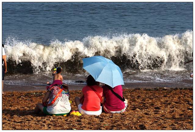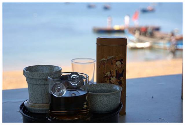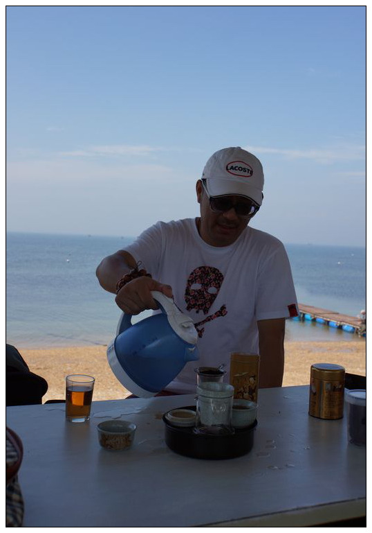 嘻嘻丈夫带了茶具和上好的普洱茶,坐在海边,喝茶聊天,真是惬意。