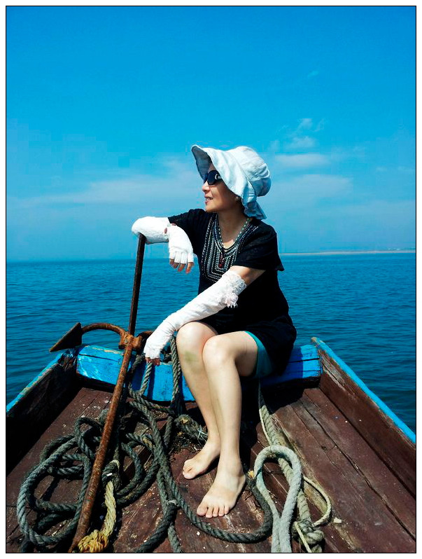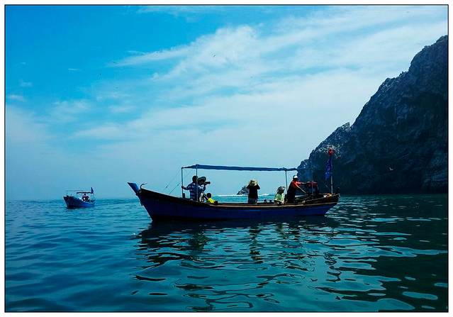 先是到了一个小荒岛,船老大说这是鸟岛,但不能上去,船停下让我们观看,鸟儿还不少。待大家拍照取乐后离去,接着在另一处海域又停下,船老大给每人发了一根线钩,让大家钓鱼,谁有这个耐心呢,还是爬到船头摆POSE了,拍了不少臭美照,带着一份满足,回到了渔村。