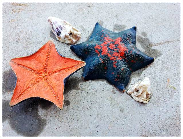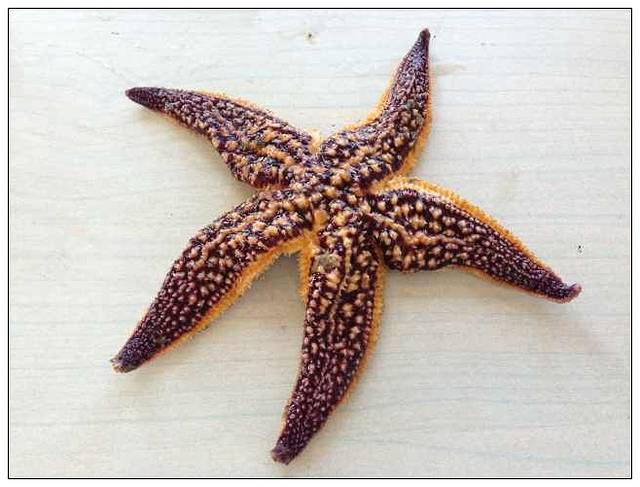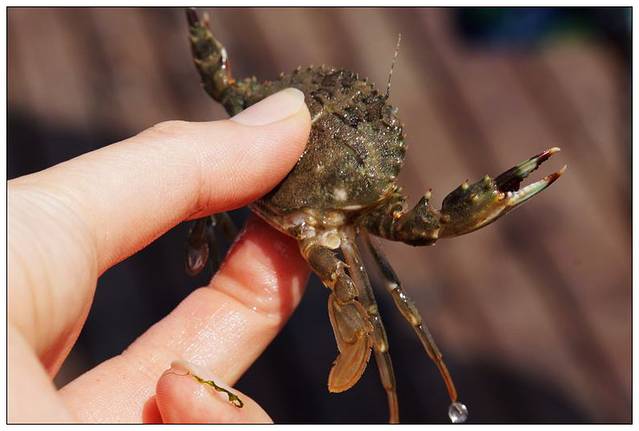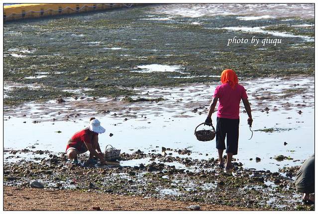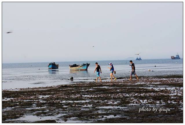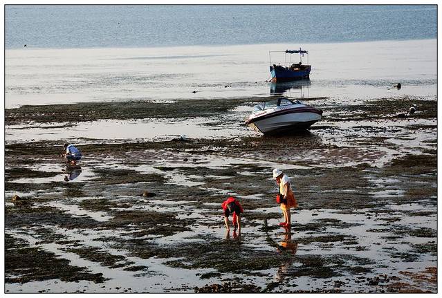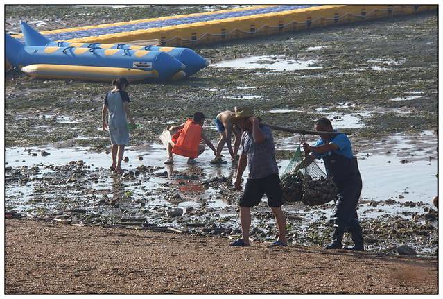 退潮了,滩涂绰影,有人下去赶海,两个孩子不断有新发现,一会儿拿来海星,一会儿拿来小蟹,欢乐一片。