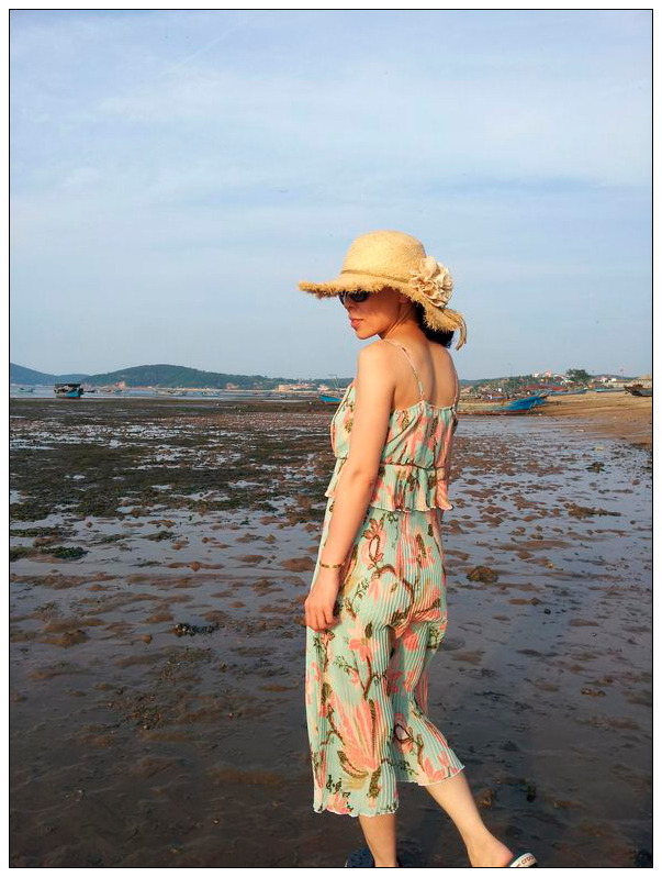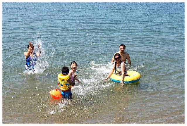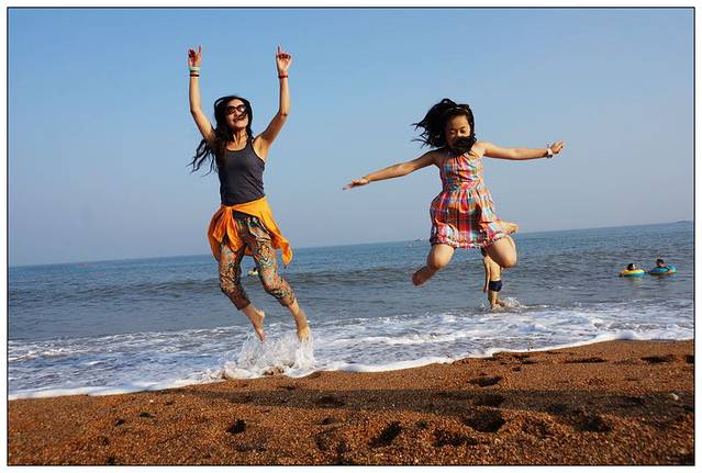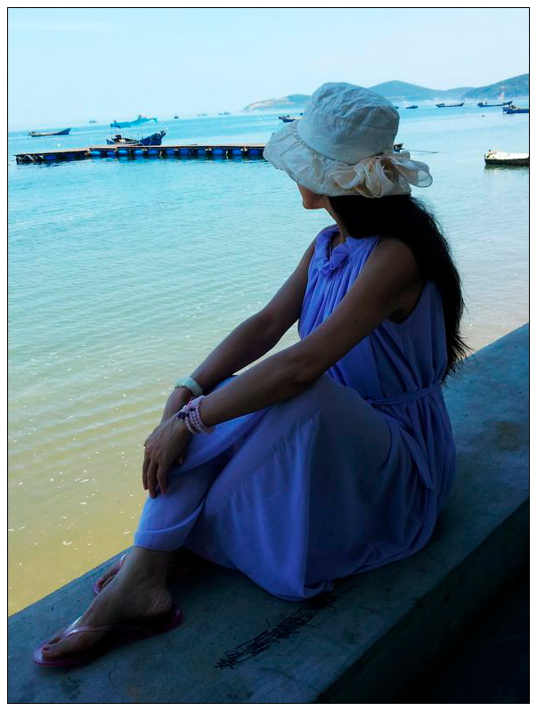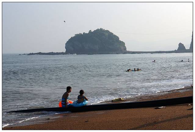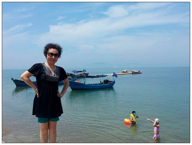 饭还没吃完,晶晶和琪琪已经迫不及待地下海游泳了,我也忍不住站到海边留个影。