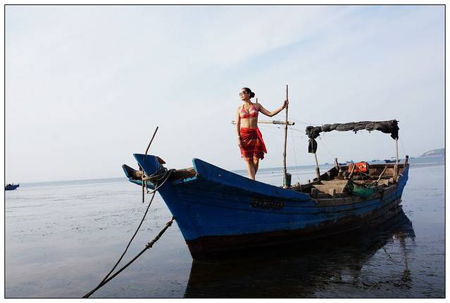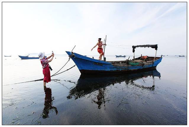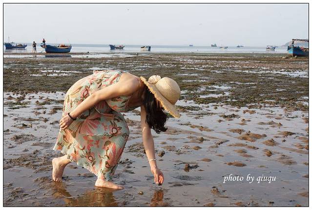 下午,美美地睡了一觉,直到太阳不再热烈。 摄影师们要搞创作了,窝窝是当然的麻豆,身着泳装闪亮登场,下到海里,蓝天白云下,渔船作衬,美轮美奂。 我没有跟着他们越走越远,嘻嘻和桑溪没带泳衣,和晶晶一起赶海,挖出了不少小螃蟹,小蛤蜊,那份童真感染着我,好喜欢这般动人的场景。 拿着相机对着她们拍了好一阵。