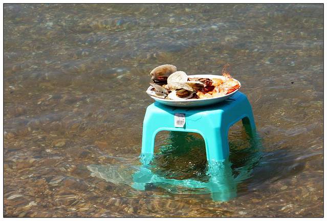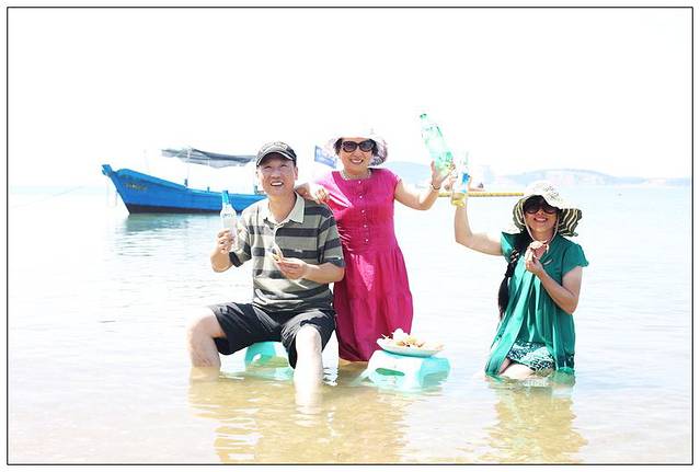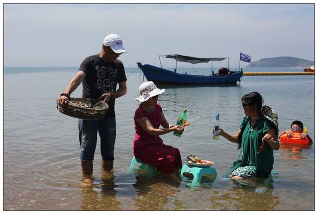 海潮慢慢涨上来,有人出怪点子了,提议到海里喝酒吃海鲜,便上演一幕海上干杯剧,笑翻了。