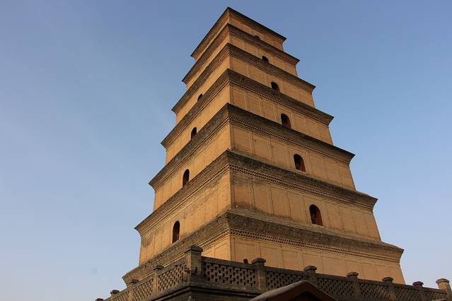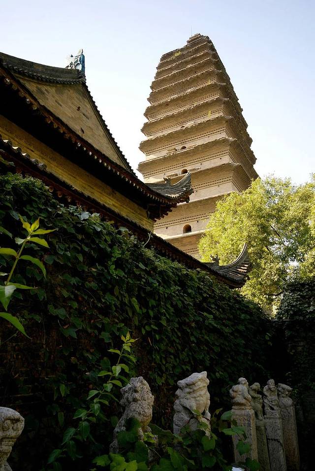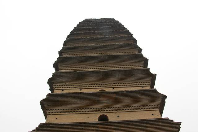 虽然它的建筑有点残缺,它甚至都没有顶,但真是这封残缺让我觉得它更真实!小雁塔是密檐式方形砖构建筑,塔身每层叠涩出檐,从下往上逐层内收,形成秀丽舒畅的外轮廓线;塔的门框用青石砌成,门楣上用线刻法雕刻出供养天人图和蔓草花纹的图案,雕刻极其精美,反映了初唐时期的艺术风格。 塔的内部为空筒式结构,设有木构式的楼层,有木梯盘旋而上可达塔顶。