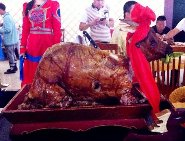 中午看到了真正的烤全羊,感觉好残忍啊!(手机拍的,像素太渣渣!)