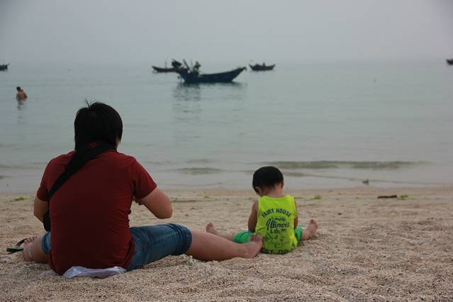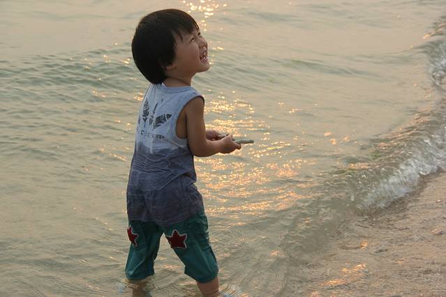 坐在沙滩上,静静地看着儿子戏水,夕阳西下,这里的生活是如此的简单~