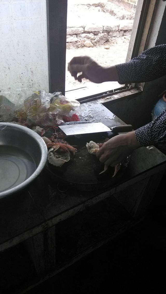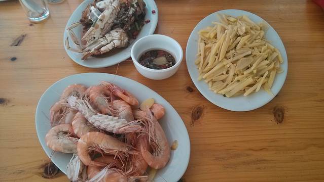 涠洲岛上专门经营饭店、排档的价位都不便宜!我们上岛的第一天就是在石螺口附近的排挡解决的,叫重庆味道,一个蛋炒饭20元,难吃指数那是高啊!一个鱼香肉丝盖饭也是20元,饭是冷的不说,这鱼香肉丝是我吃过最忽悠人的!是在忽悠我们不知道啥是鱼香肉丝吗?不建议大家去消费。在排挡吃海鲜,非常贵而且容易被宰!省钱的最好办法就是自己去南湾市场买菜回来给房东加工,这里基本上每个客栈的房东都做加工的,预定房间的时候大家可以咨询一下。一般加工费是8-10元/一个菜。(我们住的旅途客栈彭姐是收10元一个菜的加工费,早餐有粥、面和馒头提供,也是10元/人。)南湾有一个海鲜市场,每天都有渔民出海打捞新鲜的海鲜停靠南湾码头直接转手给海鲜商贩出售,比较新鲜,但不完全是野生捕捞的,也有一些是养殖的。这里的海鲜说便宜也不算白菜价那么便宜,毕竟是生猛海鲜呐,只能说海鲜的种类非常多,比较新鲜。你也可以在早上去海滩碰碰运气,也有些渔民会在海滩上直接靠岸向游客叫卖出售海鲜的!如果卖家好说话,你要的也比较多的话,或者剩下一些你都帮渔民要完了的情况下,可能能砍下不少的价格呢!彭姐说渔民在海滩上售卖的海鲜都是新鲜捕捞的野生货,我们在走的那天早上遇上了一个渔民在海滩上卖海鲜,但是只有虾和一只巨大的红蟹,我们要了一斤虾和那只一斤重的红蟹,花了160元。彭姐说还可以砍砍价,但是我们买的不多砍价也砍不下来,想想就算了难得吃顿丰富的海鲜大餐,下次大家去的话记得往死里砍价哦!中午彭姐给我们加工了虾蟹,她接待的五湖四海的客人多了也就大概知道每个地方客人的口味了,还没待我开口,彭姐就说你们桂林那边喜欢用葱姜蒜爆炒螃蟹,虾就喜欢烫水后粘酱碟吃!后来彭姐也把这虾蟹加工得很合我们的口味,我一个人就把那一斤虾和一斤重的红蟹搞定了,野生的海鲜味道的确鲜美,特别是那只红蟹,肉非常的细滑肥美!160元花得也算值了,彭姐也和我们开玩笑说,等回到桂林估计160元买这样养殖的红蟹你都买不到!很少能捕捞到那么大一只的野生红蟹的!这也是在石螺口住宿的一个优点,随时都有可能遇到捕鱼的渔船归来,收获一些新鲜货!如果是拖带的行李不多的话,大家可以在岛外买一些新鲜的蔬菜还有肉上岛,直接交给房东,在岛上买一些海鲜一并加工就把几顿饭解决了。岛上的猪肉很贵,20元一斤,这里的猪都是吃香蕉长大的土猪,据说很好吃,我们也没有买就不得而知了。和我们住一个客栈的有7、8个老人专门从江苏来涠洲岛度假的,住了好几天,他们连葱姜蒜都自带上岛,别说蔬菜了,他说都是从老家带过来的无公害的!他们一群人每天早上都到海滩上去等候捕鱼归来的渔船,然后买进几斤生猛海鲜,也有低价买一些刚死不久的鱼虾,便宜很多呢!不过海鲜还是吃活的,死的还是别买了,别一个不小心吃的不合适腹泻了咋办?