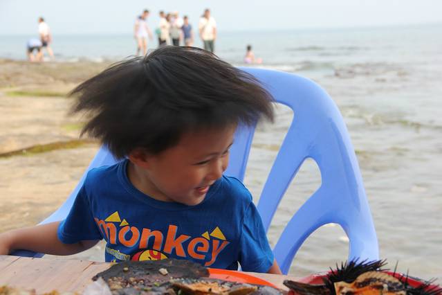 岛上几个海滩景区都有海鲜烧烤摊,比较了一下还是五彩滩的比较便宜,那里的风景很美,面朝大海,摆上一个小桌,吹着海风尝着海鲜,实在是惬意得不得了!五彩滩最靠左边有一家叫旭来顺的烧烤摊,味道烤的不错,价格也便宜,鲍鱼大的15元两个/小的5元一个,海参10元/个,生蚝10元/3个,扇贝10元/12个,海胆15元/个,带子10元/个,比起在海鲜排挡吃要便宜不少,而且是烤着吃很香!超赞!第一天去了我还没吃过瘾,第二天还特地开着小电驴又去了一次!