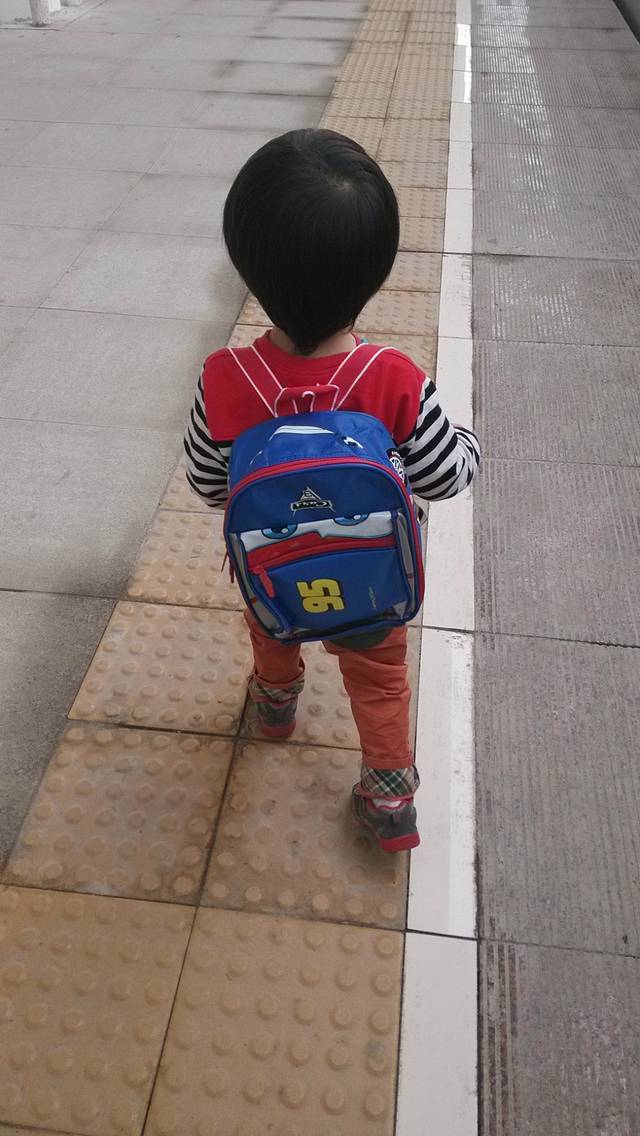 仔仔很自觉背着自己的汽车人包包~准备去坐詹姆士小火车咯~