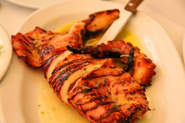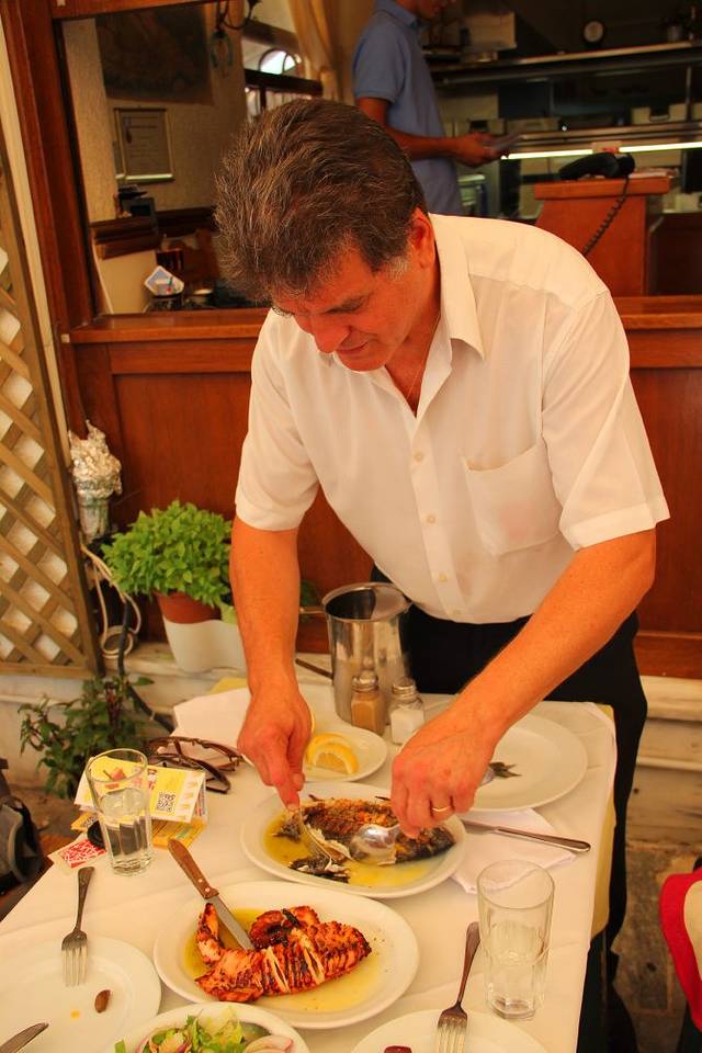 上来之后老板会帮忙把鱼头鱼尾和鱼刺用刀叉去除,章鱼和鱿鱼肉烤的很嫩,金枪鱼沙拉也非常美味。这样一餐一共是37.7欧,不算便宜,但两个人吃的很饱。老板的刀叉技术很高超哦~分分钟把鱼剔骨只剩鱼肉。
