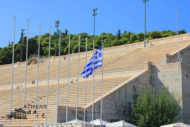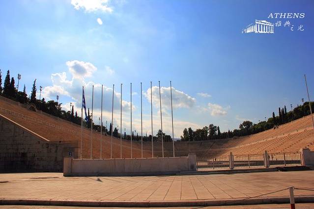 雅典竞技场是第一届现代奥运会的会址,竞技场呈马蹄形,场内两根平行的线,连接着一小段弯弯的弧,顺着直线和弯弧是用白色的大理石堆砌而成的一排排座位,可容纳万名观众。