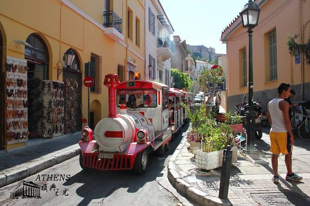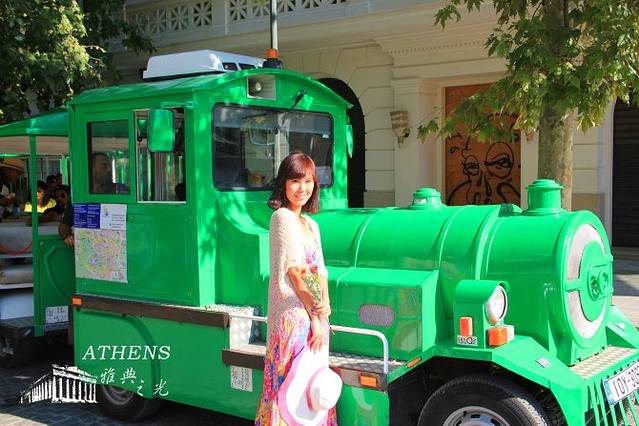 雅典的温度虽然不高,但阳光真的很晒。转了一圈,发现一辆游览的观光小火车。每人5欧的票价,围着附近的几个景点转一圈。