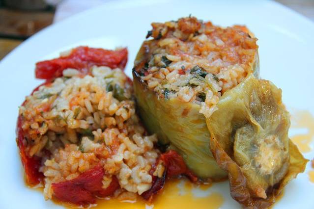 番茄塞饭和青椒塞饭是希腊特色美食,把大番茄和青椒掏空塞进炒饭,好吃~