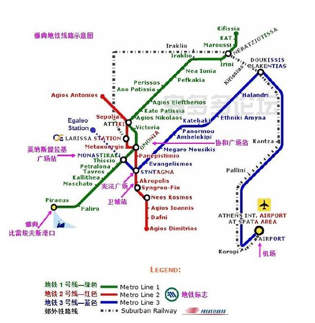 1. 蓝线从Monastiraki到Egaleo Station是后修的,已经修好,但因为用的同学不多,所以就略过中间站直接写的总站(中间站可以参考时刻表上的站名)