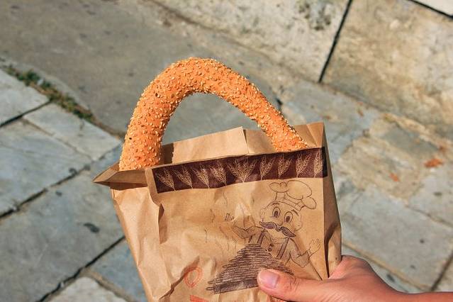 雅典特色小吃,这种圈圈在希腊街头十分常见,有点像长棍面包,硬硬的,嚼起来很香,咬一口会掉芝麻。类似中国的油条,可以当早餐~