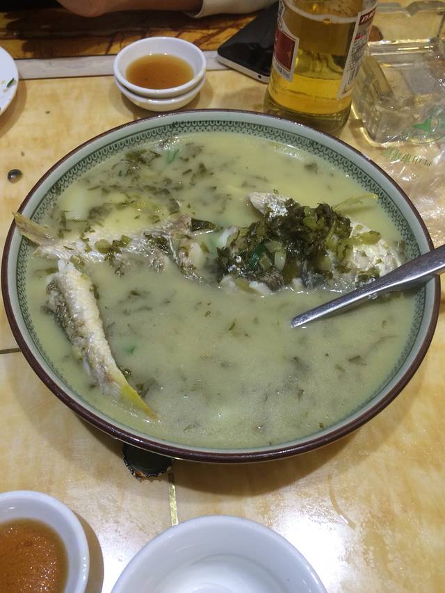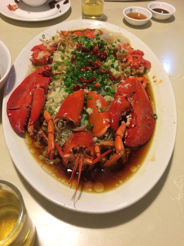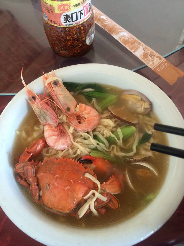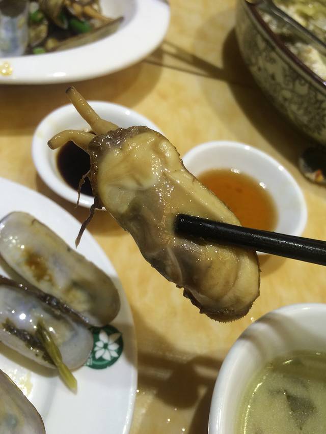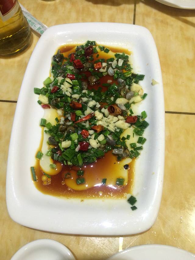 我们是安徽合肥人,刚好出租车司机也是合肥人,递了一根普皖聊开了,他介绍了大排档,滨港路的第一家,开了比较久了,装修也还不错。店老板相当热情,价格也吓死人,去舟山最好吃大黄鱼,中央电视台远方的家栏目也推荐过,可是大黄鱼实在太贵了,一家店总共就两条,说这条街上也没几条了,因为是繁殖季节,他们才能搞到,否则会全部被五星级酒店订走,并且价格也至少在500块钱一斤。我们犹豫了半天,要了比较小的,288一斤,一条鱼干掉400多。选完之后老板把鱼往地下一惯,鱼就挂了,送后厨烹饪,舟山最地道的做法就是雪菜大黄鱼,不加其他调料,用腌制的雪菜烧汤,连盐都不用放。我认为味道真心不错,肉像蒜瓣一样,非常鲜,但是男朋友对海鲜不感冒,认为跟清真鲈鱼差不多。除了大黄鱼还有石斑鱼,不便宜哦,还有蛏子(比在家吃的肥多了)螺丝,圆贝,这些价格略便宜一点,人均消费300,不吃大黄鱼的话人均120左右吧,如果吃了石斑鱼,超级大的螃蟹,也够呛。其他的店都是一样的模式。