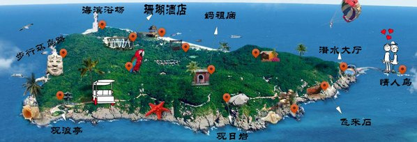 路线:亚龙湾度假区-大东海度假区-三亚湾度假区-西岛(玳瑁岛)码头-天涯海角游览区。
