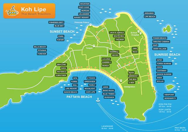 有三个沙滩,地图上可以看到分别为Pattaya, sunrise, sunset海滩。沙滩的质量也是如上排名,Pattaya最好也最方便,唯一缺点靠近主步行道那边船多较吵,但是sita那边就很安静了,建议就住Pattaya,因为没有别的交通工具,纯走还是挺远的从码头去别的沙滩,况且沙滩也不好,就是Pattaya的沙滩最大最细了。sunrise是看日出的海滩,sunset可以看日落。