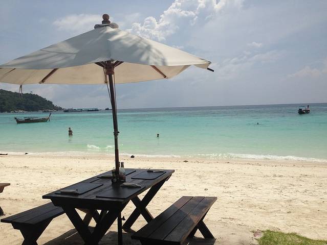 一个小时到达泰国丽贝岛,记住有1小时时差所以你9:30马来时间出发,到了泰国还是9:30泰国时间。大船先是停在靠近岸边的一个平台,所有人拿着行李登上平台,再换坐小船抵达岸边,然后要自己下海走上去,所以行李一定少带,穿拖鞋。