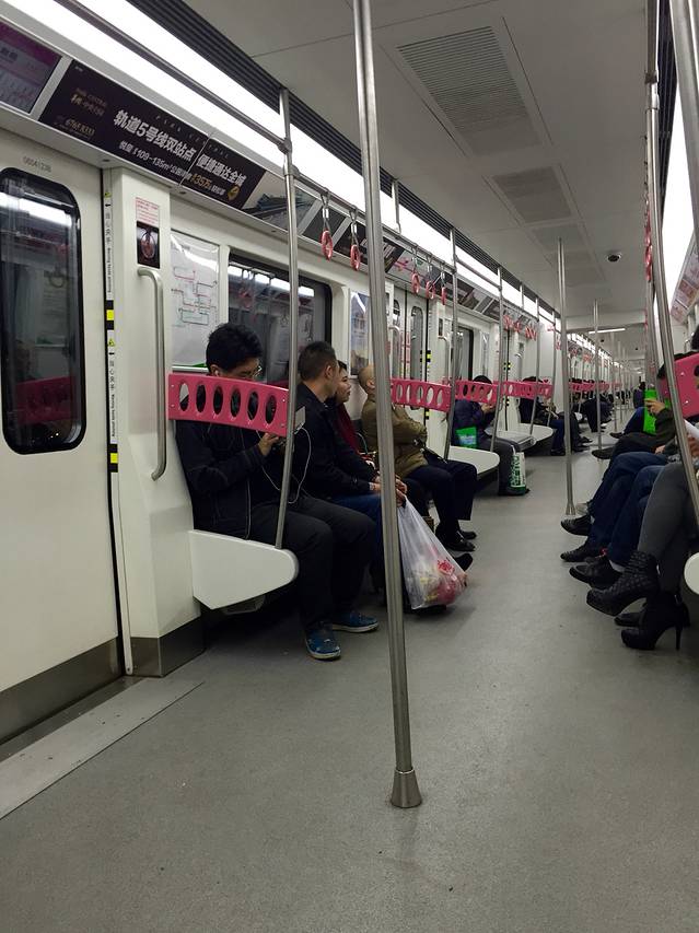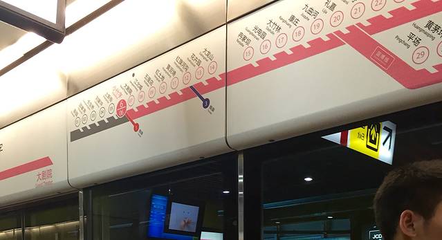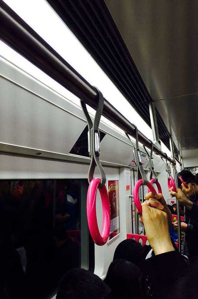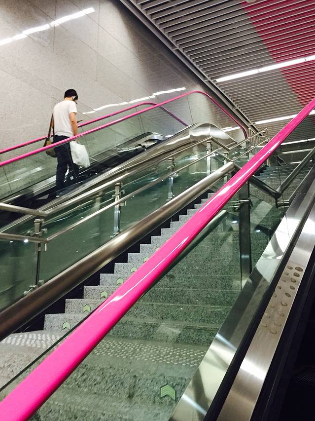 无地点,想说说这重庆的交通。在重庆开车,或许还真不是最快的交通方式,倒不如乘坐轻轨。在重庆乘坐轻轨是很有趣的,穿山,跨江,过桥。小列车飞快的带你看尽沿途风景。每一条轻轨线都有一种统一的颜色,既方便了乘客换乘、又有一种很温馨很规范的感觉。我一定要提一下的就是6号线。卡哇伊内,整个粉粉的、萌萌哒。从电梯扶手就粉了哪。我爱重庆的轻轨。