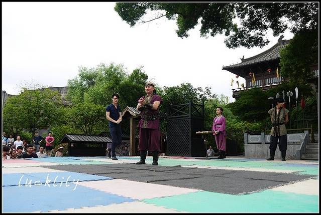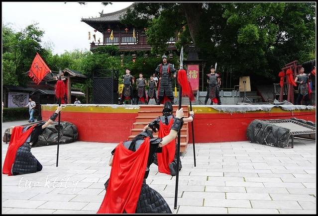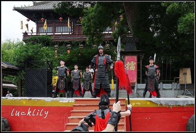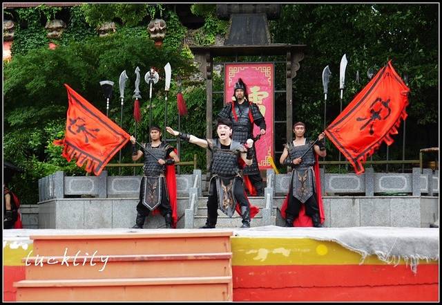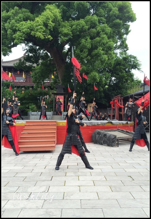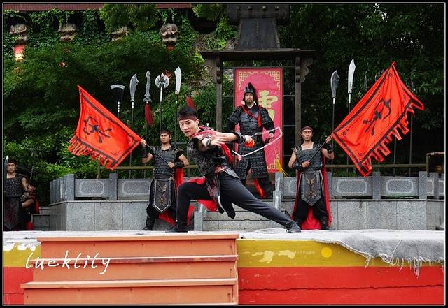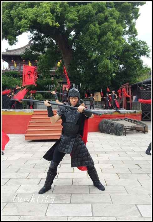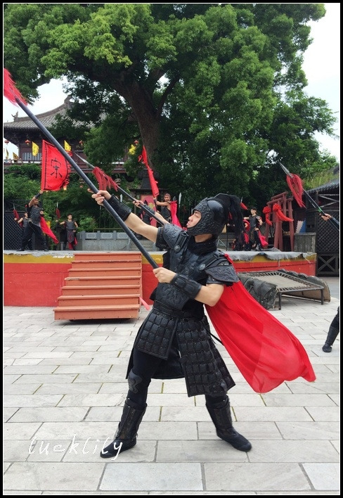 宋城核心景区古城门大门口有一颗千年古老的大樟树,这大樟树下的舞台也是宋城的标志性建筑之一。这里每天场次不断的上演着各式各样的表演,我曾经在这里欣赏到梁山伯祝英台十八相送的越剧选段,也在这里看到天降财神的神奇场面……今年又有了新意了,一起来鉴赏一下岳飞练兵的强悍阵容吧!