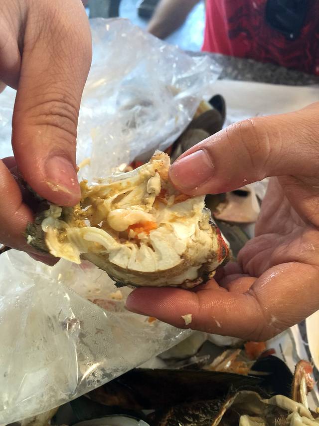 另一个不得不提的是螃蟹,本地土著母蟹,5.99一磅,整个蟹壳里塞满了蟹黄,挖出来好像吃馒头一样,差点没噎到,如果觉得蟹壳太厚不方便品尝,可以花3美元租个小木槌,用完后还给服务台就可以拿回钱,不需要收据。人多的时候,整个排档的就餐区都是叮叮噹噹砸蟹的声音,看来老外也好这口。不过也有例外,我们就曾见过一名黑人妇女跑来问:whatsthe difference between male and femalecrab?工作人员的回答是:母蟹比较贵,汗,好没有技术含量的好吗?