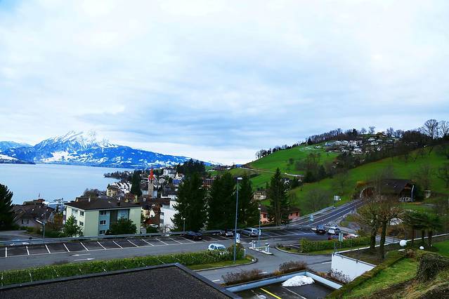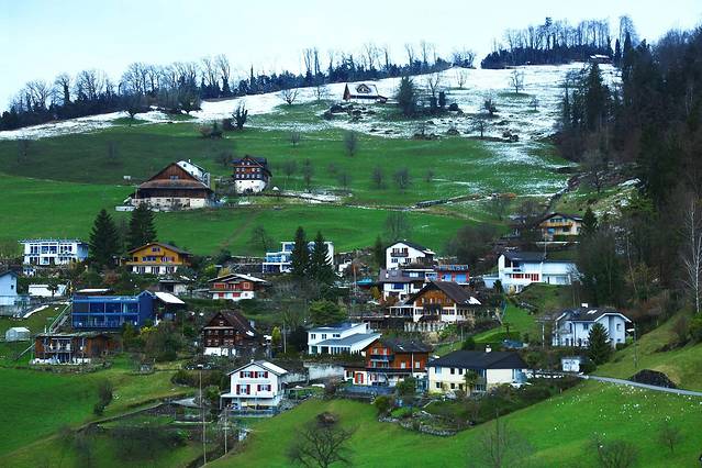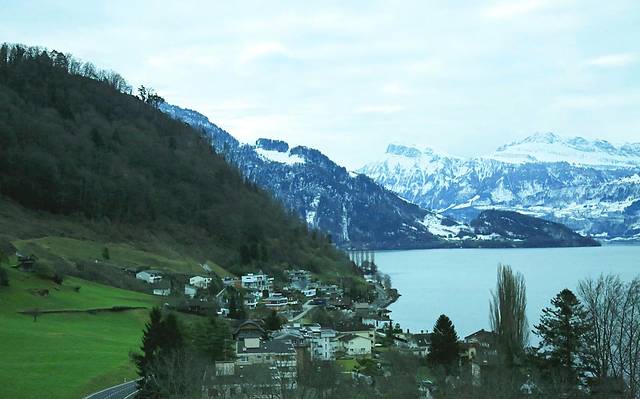 琉森湖边绿草如茵错落的房子还有白雪