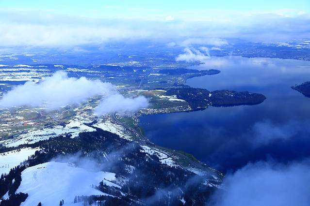 瑞吉山上俯拍琉森湖的美景,雪山,湖泊,云雾,蓝天那么飘渺那么虚幻那么迷人