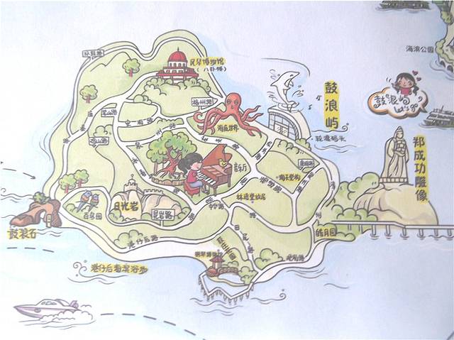 鼓浪屿:原名圆沙洲、圆洲仔,因海西南有海蚀洞受浪潮冲击,声如擂鼓,明朝雅化为今名。由于历史原因,中外风格各异的建筑物在此地被完好地汇集、保留,有“万国建筑博览”之称。小岛还是音乐的沃土,人才辈出,钢琴拥有密度居全国之冠,又有“钢琴之岛”的美称。
