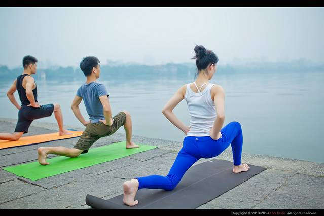 经过断桥是偶然遇到一群瑜伽学员正在晨练